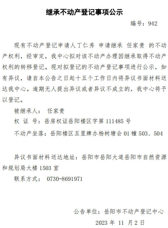 继承不动产登记公示 编号:丁仁秀(942)