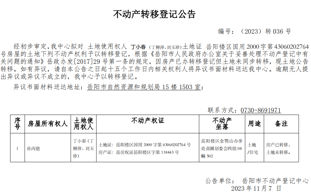 不动产转移登记公告 编号:(2023)转036号(丁小春)