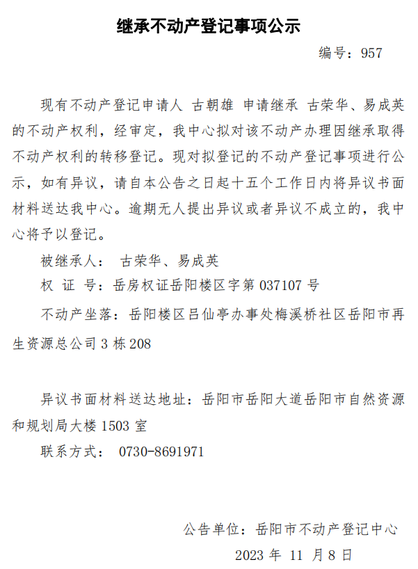 继承不动产登记公示 编号:古朝雄(957)