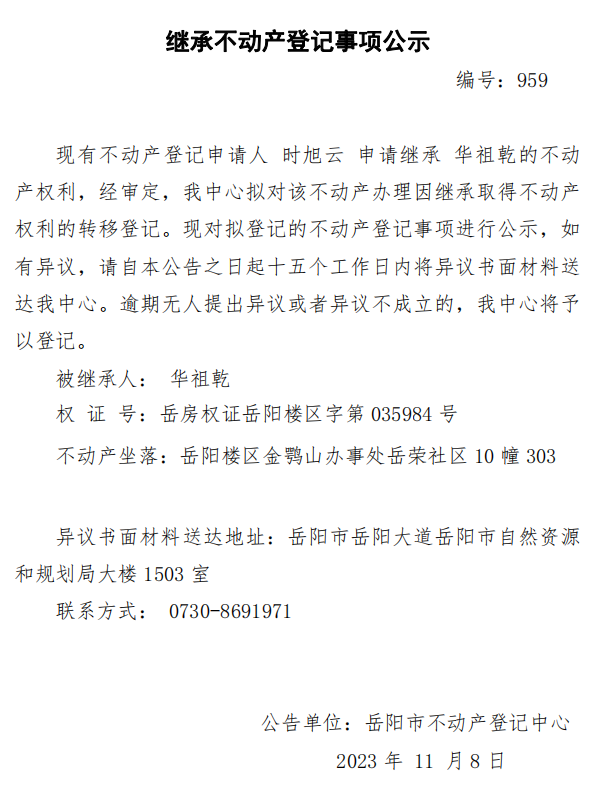 继承不动产登记公示 编号: 时旭云(959)