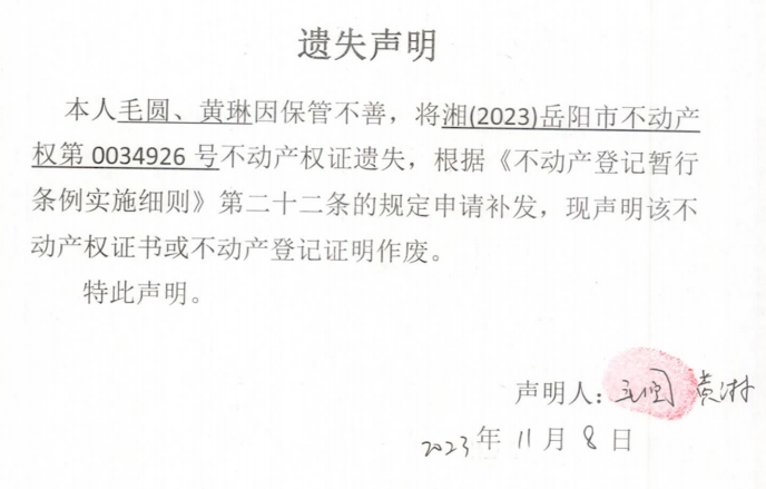遗失声明(毛圆、黄淋)