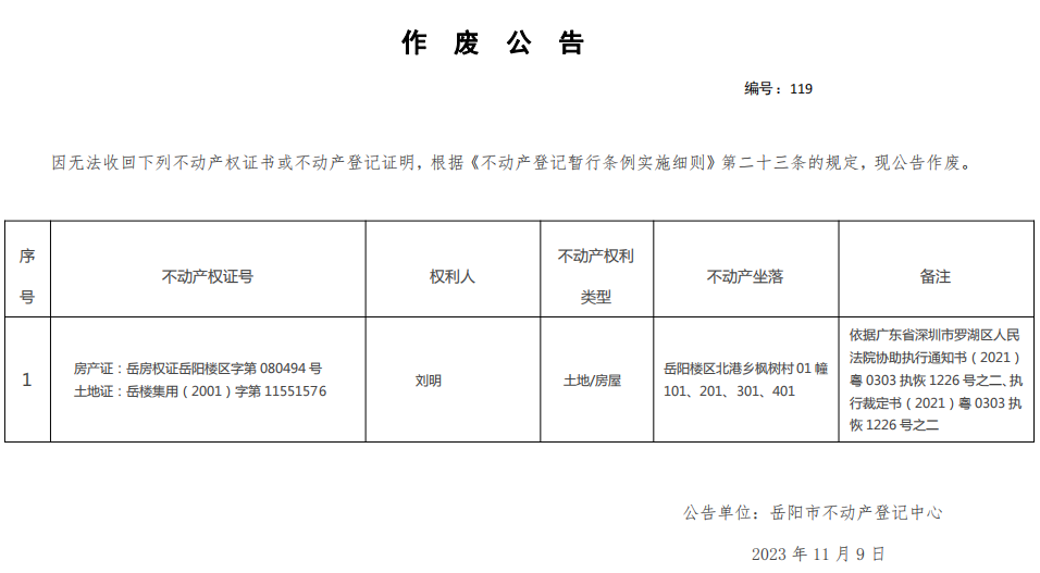 作废公告 编号:刘明(119)