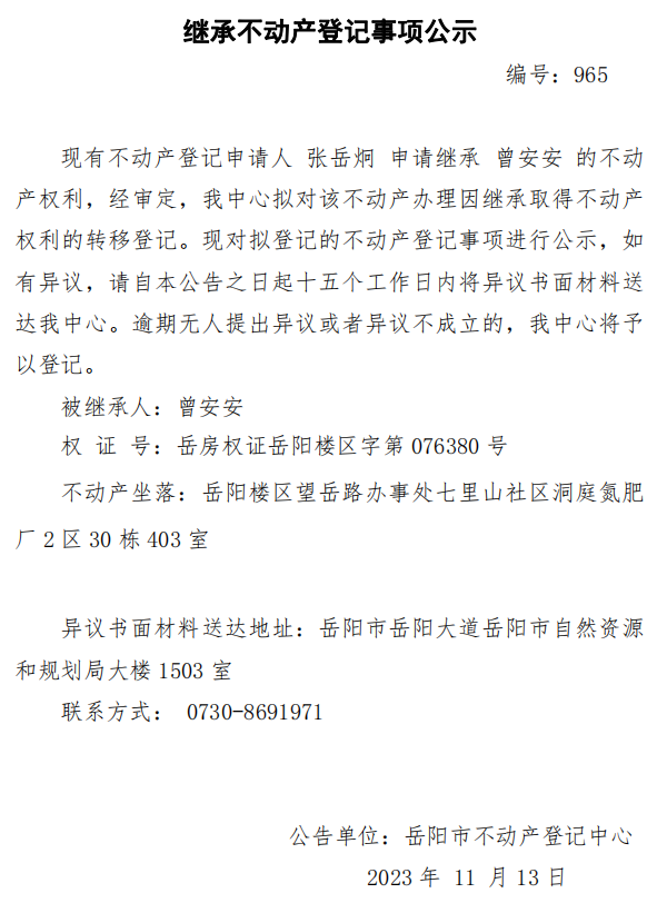 继承不动产登记公示 编号:张岳炯(965)