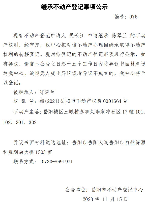 继承不动产登记公示 编号:吴长江(976)