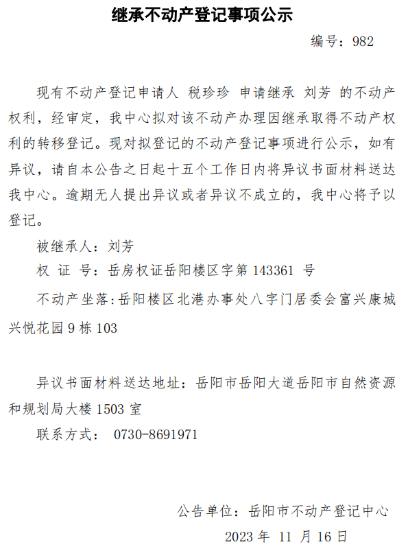 继承不动产登记公示 编号:税珍珍(982)