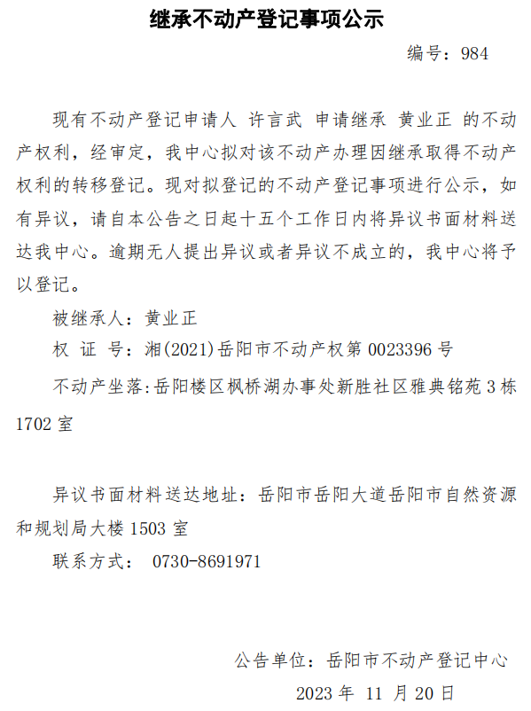 继承不动产登记公示 编号:许言武(984)