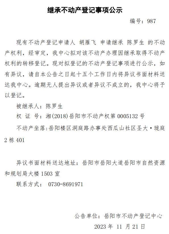 继承不动产登记公示 编号:胡雁飞(987)