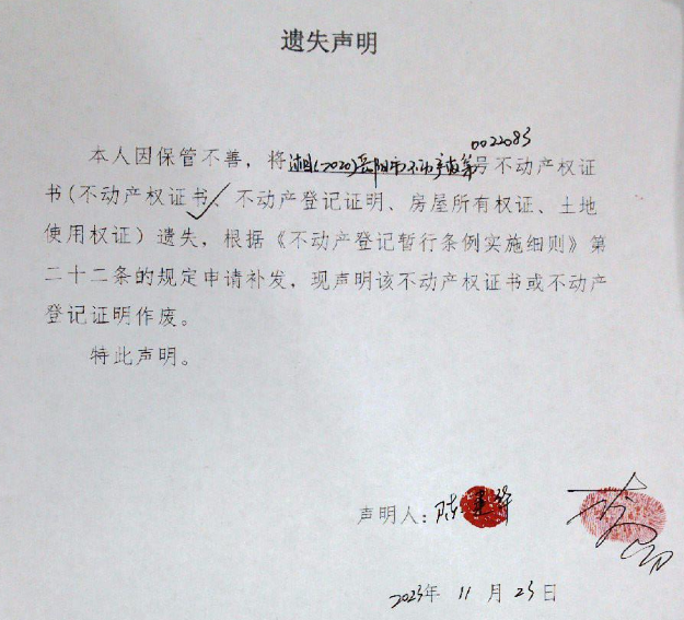 遗失声明(陈建华、李阳)