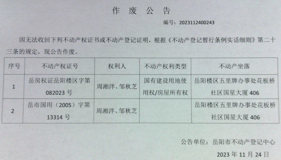 作废公告(周湘泮、邹秋芝)2
