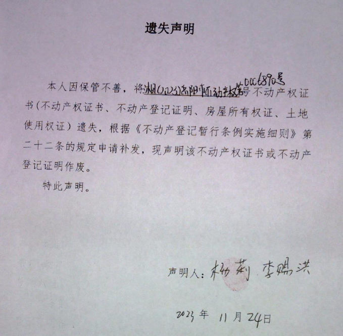 遗失声明(李赐洪、杨莉)