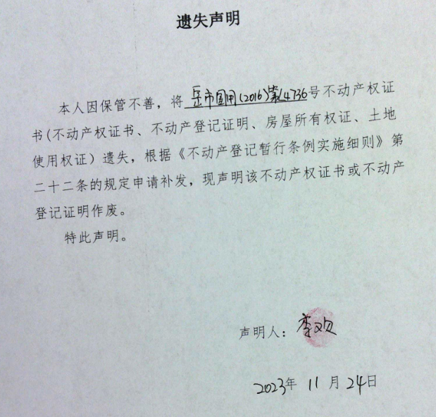 遗失声明(李欢)