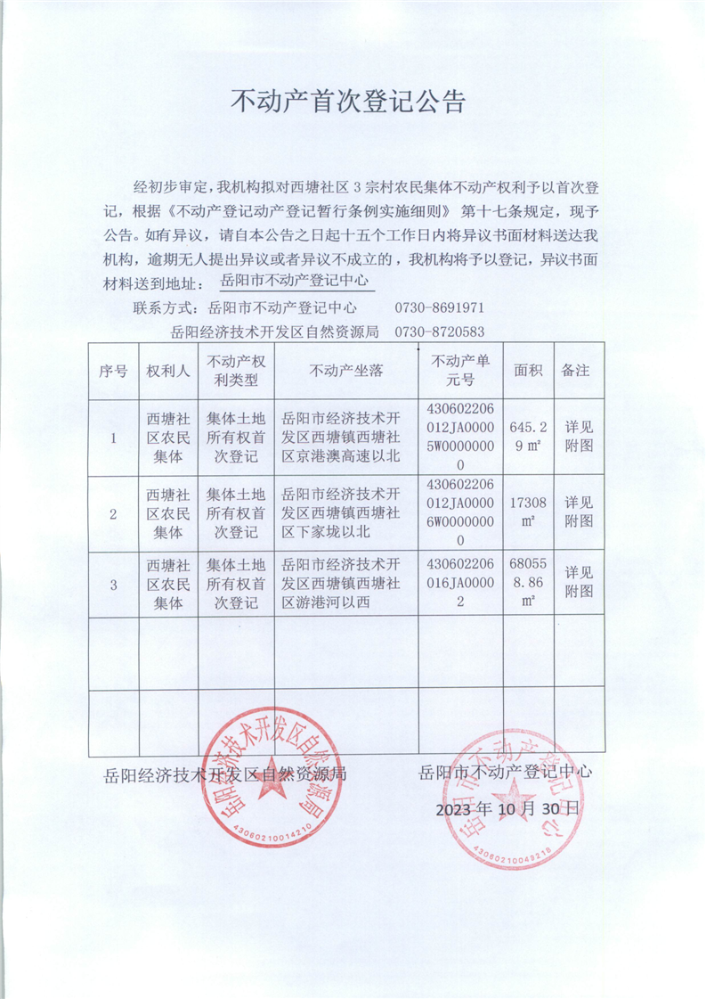不动产首次登记公告(西塘社区)