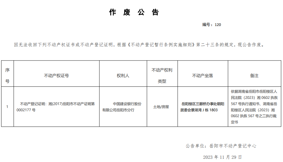 作废公告 编号:中国建设银行股份有限公司岳阳市分行(120)