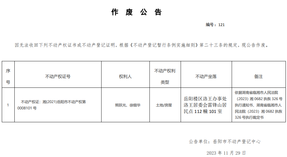 作废公告 编号:熊跃光、徐细华(121)
