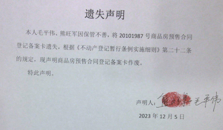 遗失声明(毛平伟、熊旺军)