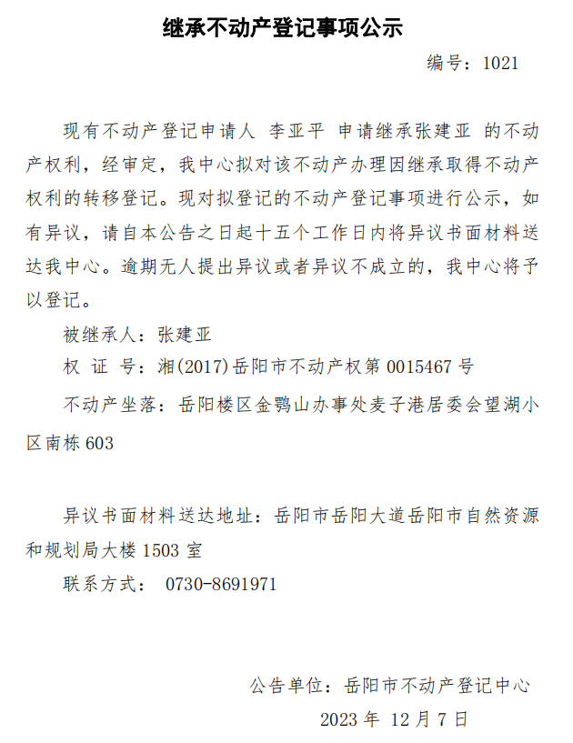 继承不动产登记公示 编号:李亚平(1021)