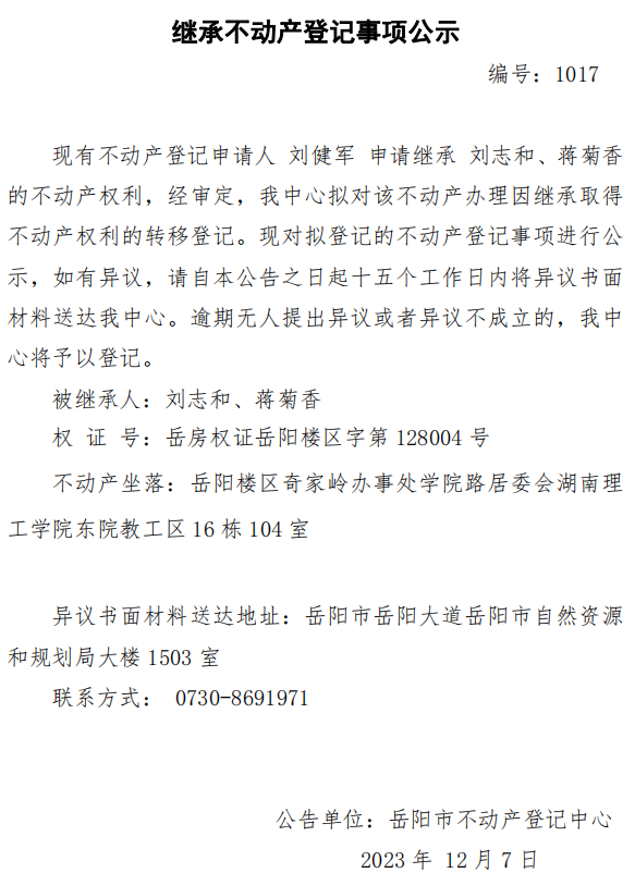 继承不动产登记公示 编号:刘健军(1017)