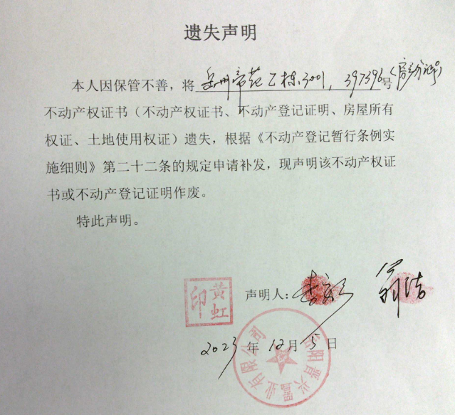 遗失声明(李安乡、翁洁)