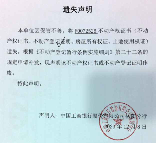 遗失声明(中国工商银行股份有限公司岳阳分行)1