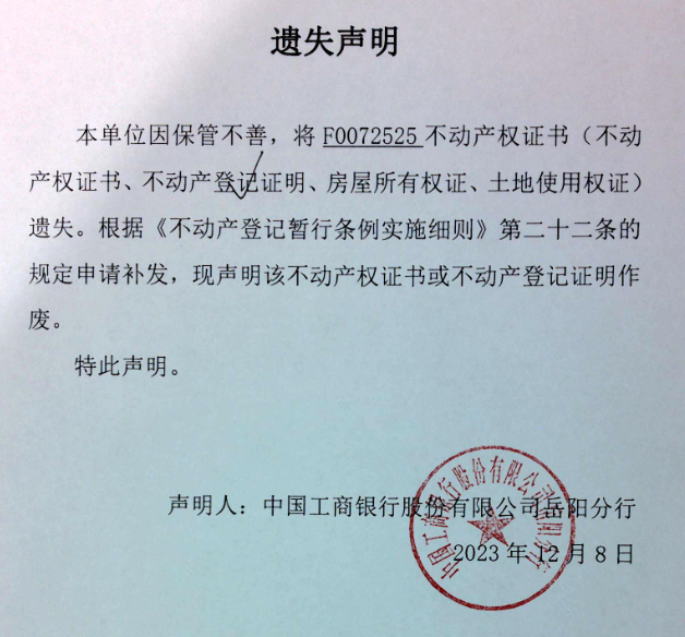 遗失声明(中国工商银行股份有限公司岳阳分行)2