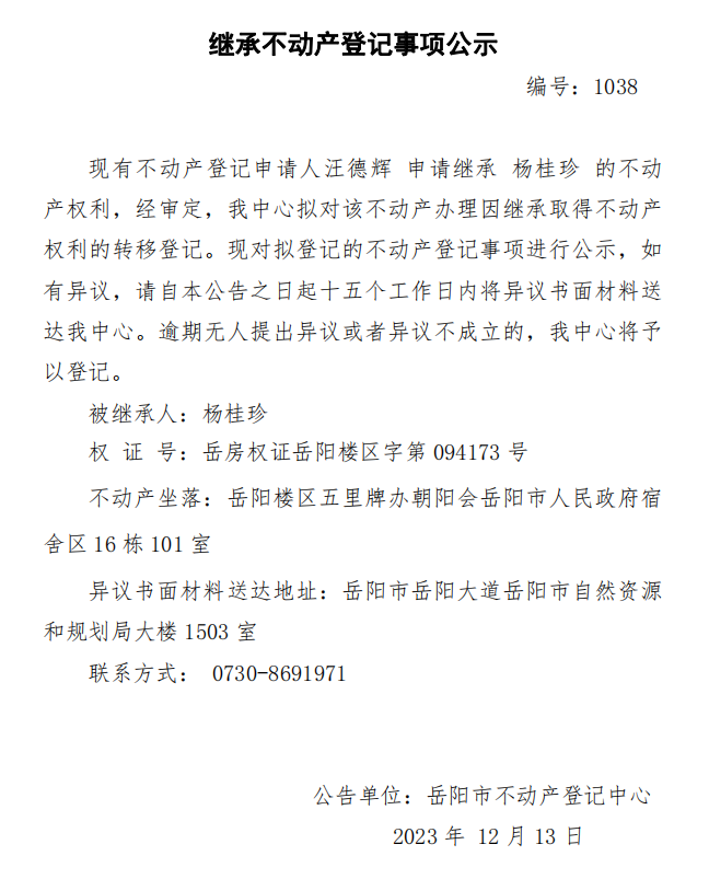 继承不动产登记公示 编号:汪德辉(1038)