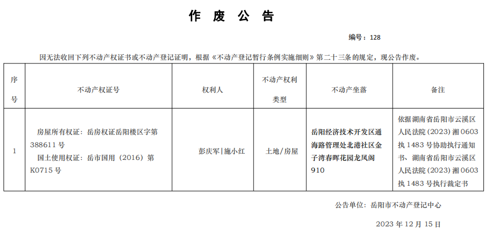 作废公告:编号:彭庆军、施小红(128)