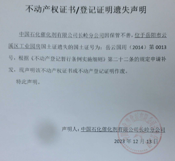 不动产权证书遗失声明(中国石化催化剂有限公司长岭分公司)