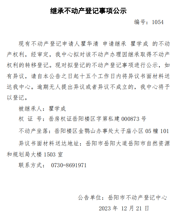 继承不动产登记公示 编号:瞿华清(1054)