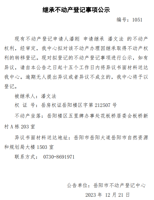 继承不动产登记公示 编号:潘刚(1051)