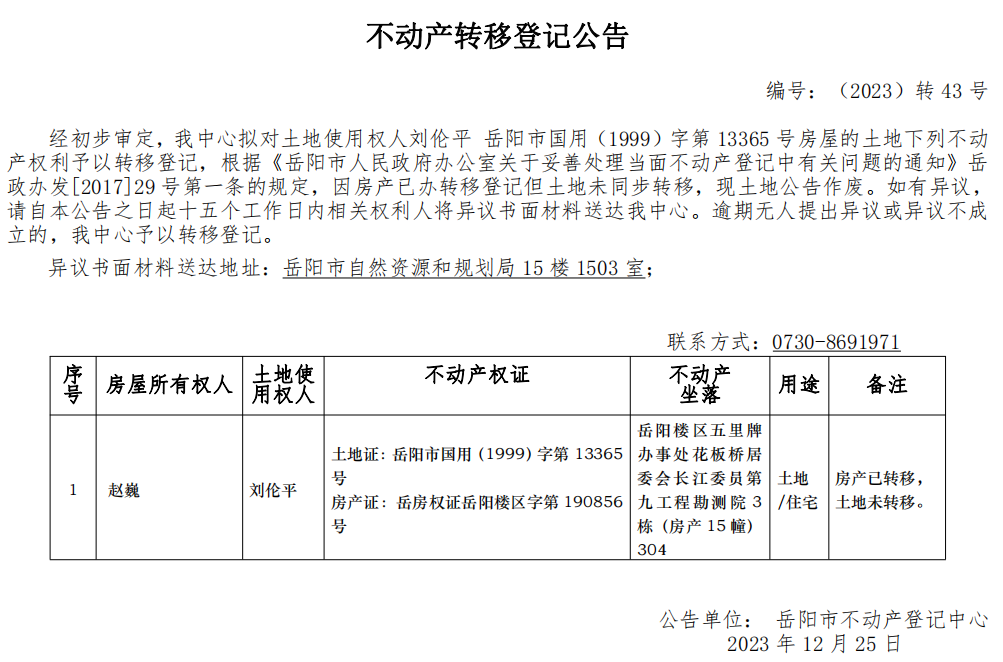 不动产转移登记公告 编号:(2023)转043(刘伦平)