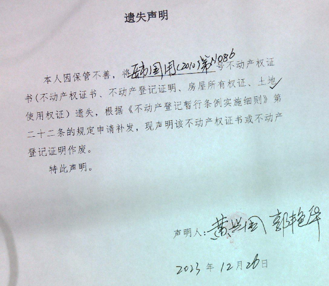 遗失声明(郭艳华、黄兴国)