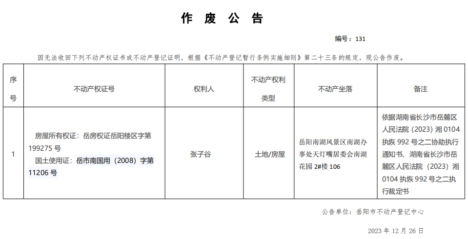作废公告 编号:张子谷(131)