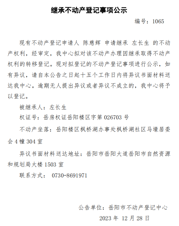 继承不动产登记公示 编号:陈慈辉(1065)