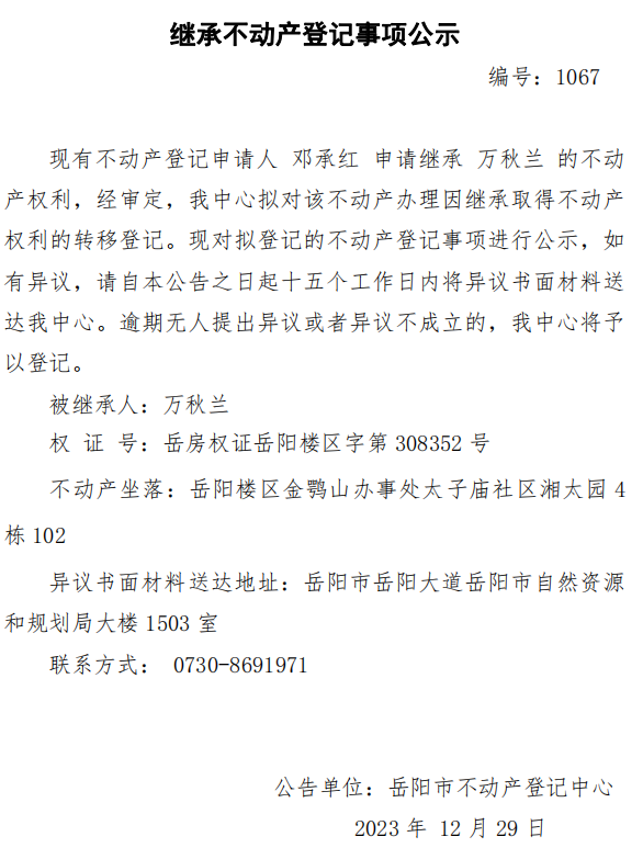 继承不动产登记公示 编号:邓承红(1067)