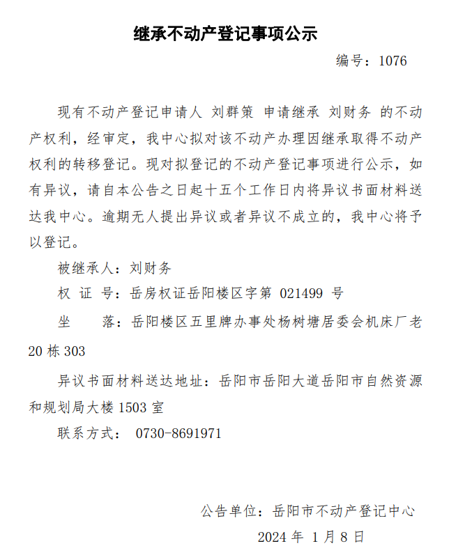 继承不动产登记公示 编号:刘群策(1076)