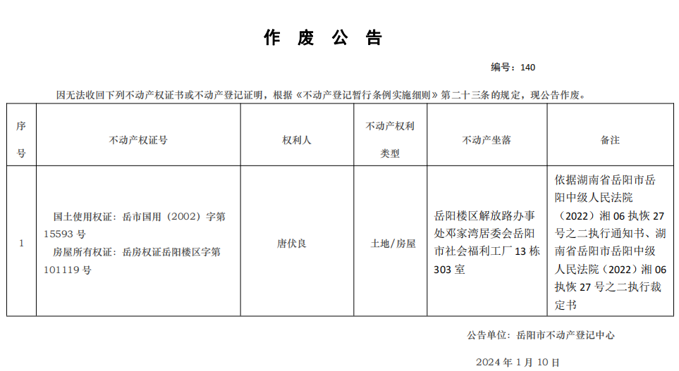 作废公告 编号:唐伏良(140)