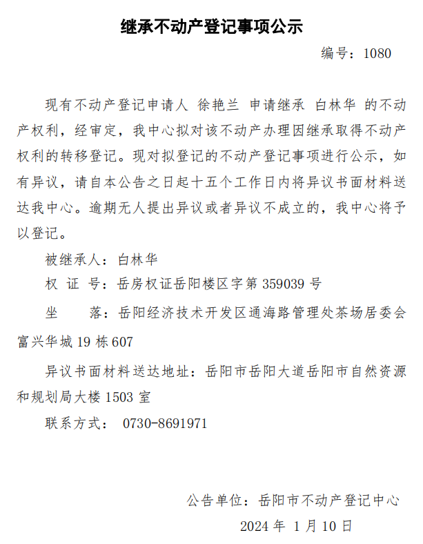 继承不动产登记公示 编号:徐艳兰(1080)
