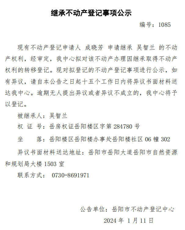 继承不动产登记公示 编号:成晓芳(1085)