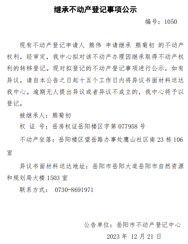 继承不动产登记公示 编号:熊伟(1050)