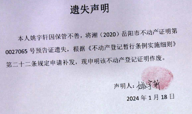 遗失声明(姚宇轩)