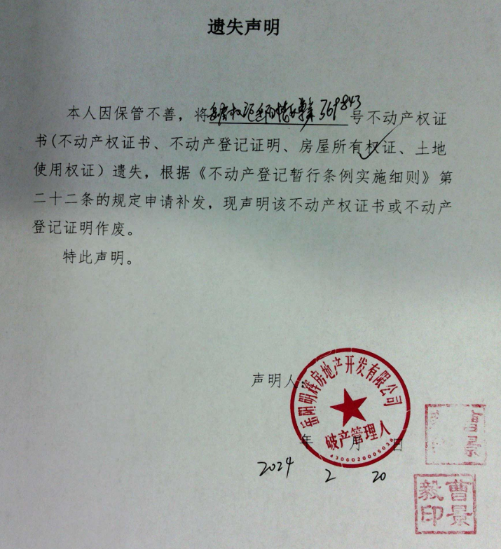 遗失声明(岳阳明辉房地产开发有限公司破产管理人)3