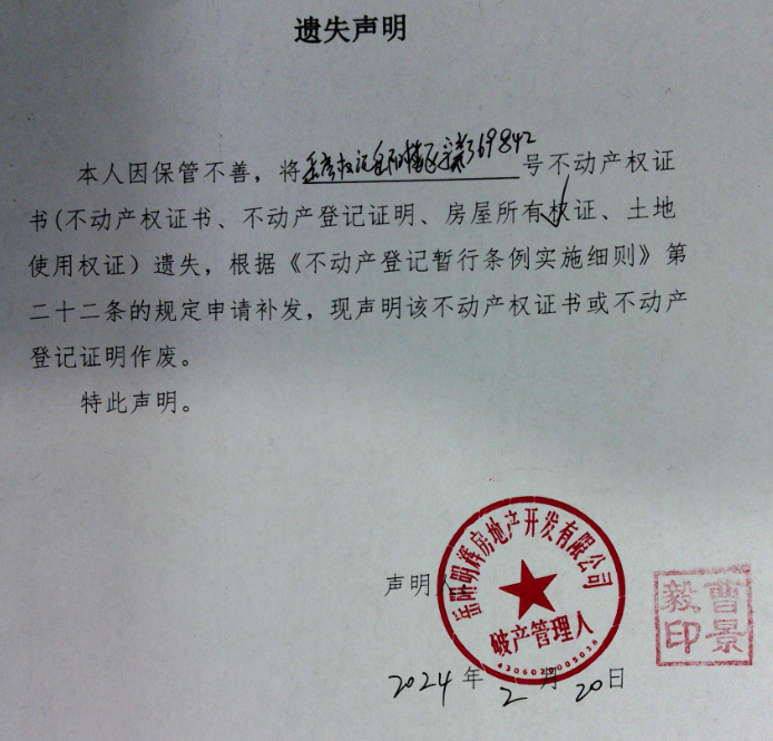 遗失声明(岳阳明辉房地产开发有限公司破产管理人)2