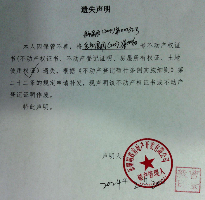 遗失声明(岳阳明辉房地产开发有限公司破产管理人)1