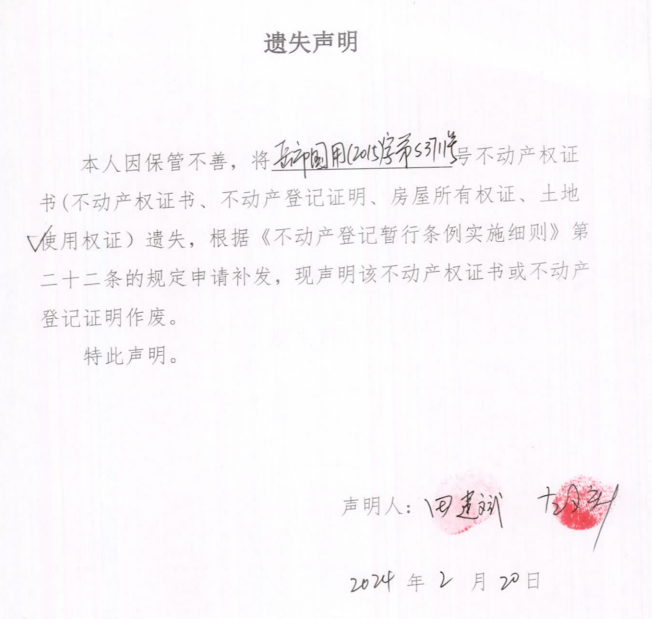 遗失声明(田建斌、左文新)