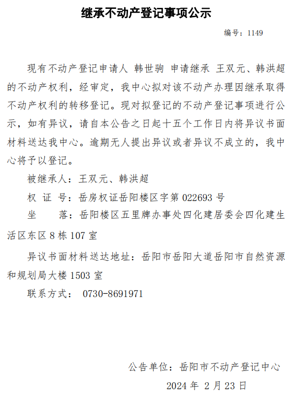 继承不动产登记公示 编号:韩世驹(1149)