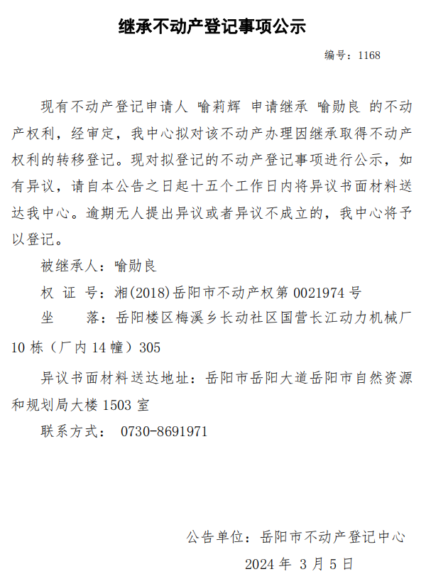 继承不动产登记公示 编号:喻莉辉(1168)