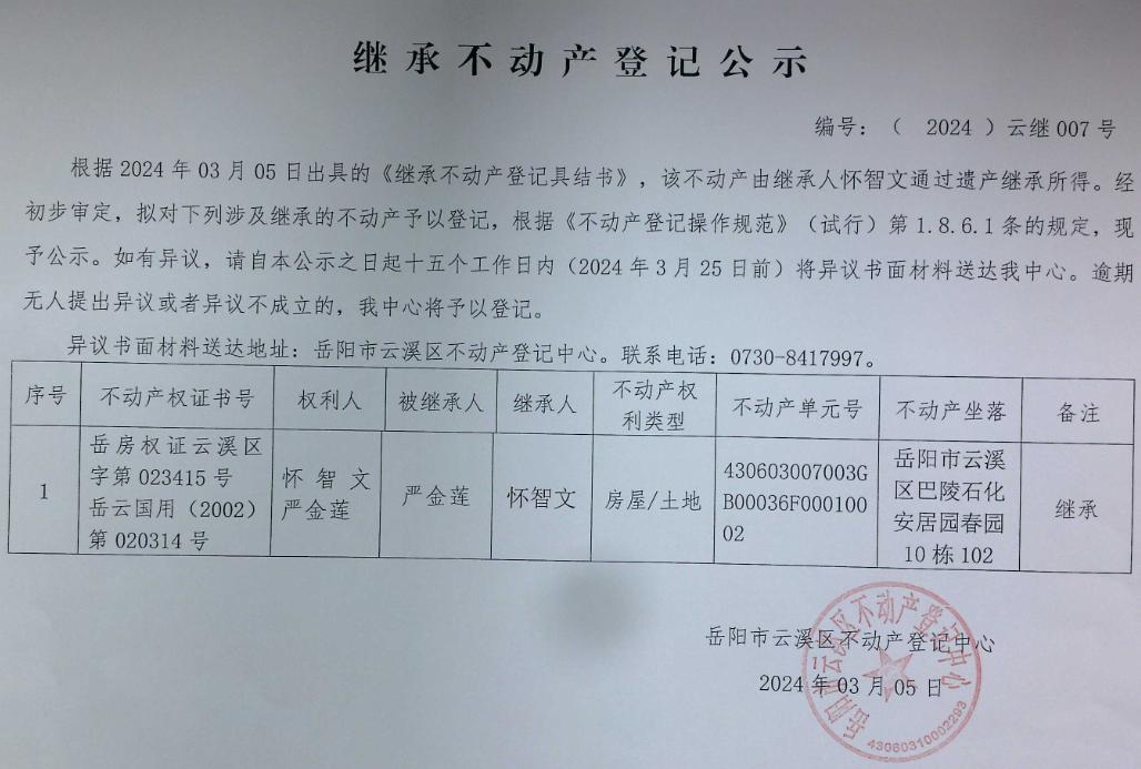 继承不动产公示 编号:(2024)云继007号