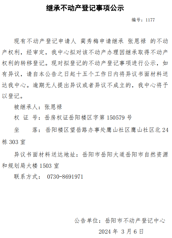 继承不动产登记公示 编号:蔺秀梅(1177)