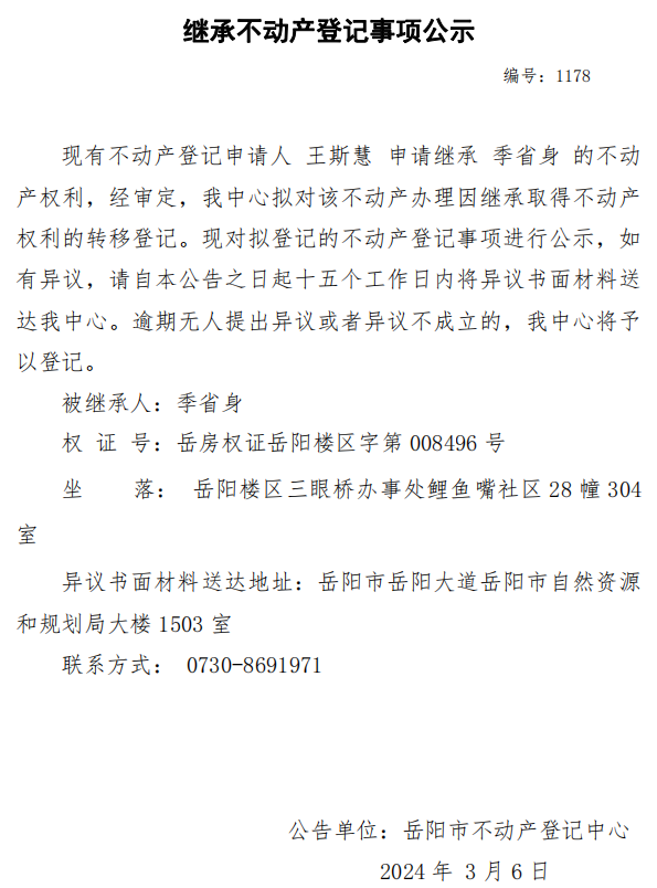 继承不动产登记公示 编号:王斯慧(1178)