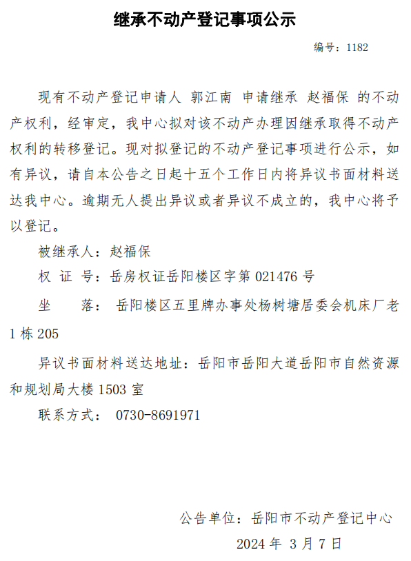 继承不动产登记公示 编号:郭江南(1182)